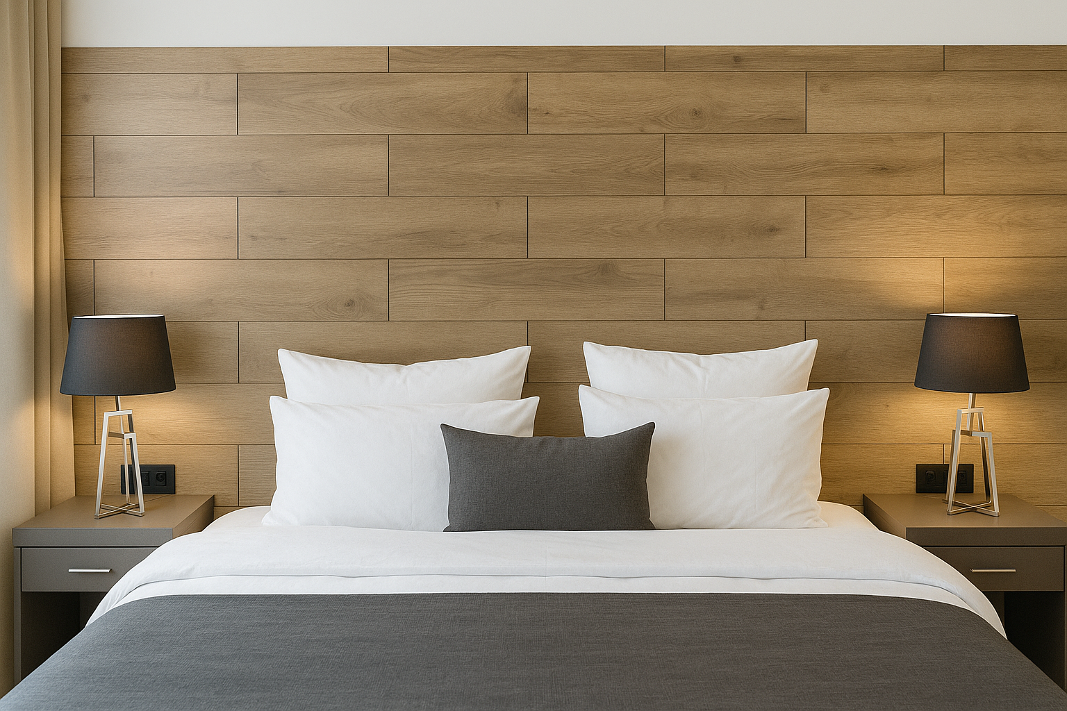 - Ciepłe światło podkreśla drewno, beże i ciepłe odcienie