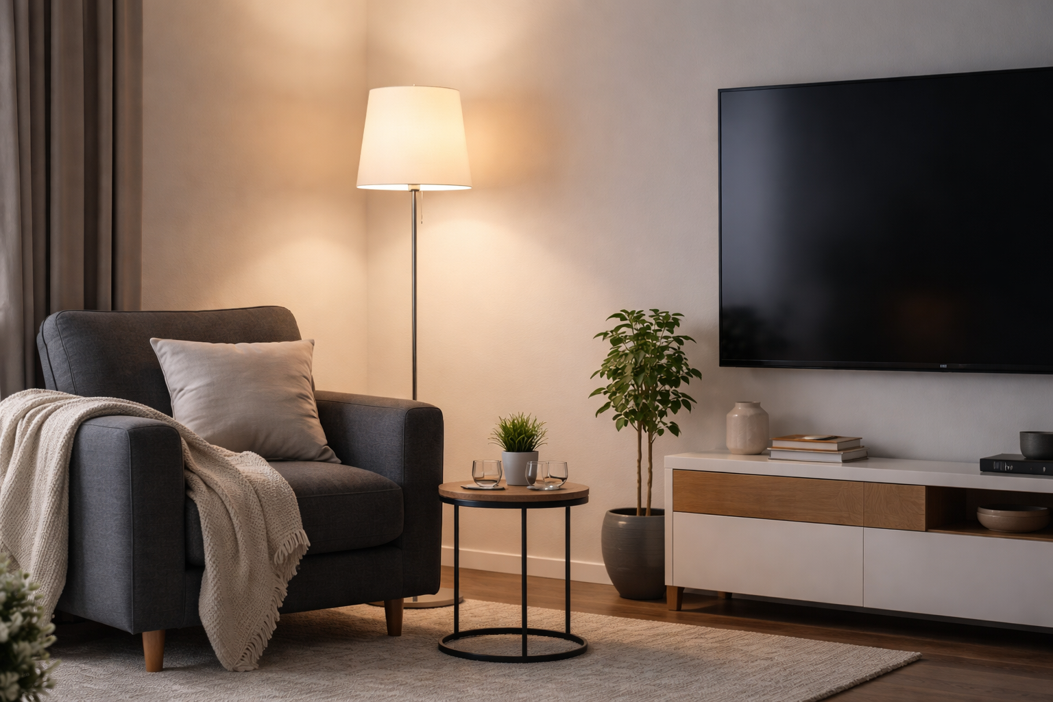 - oświetlenie pośrednie (np. LED za telewizorem, pod półkami)