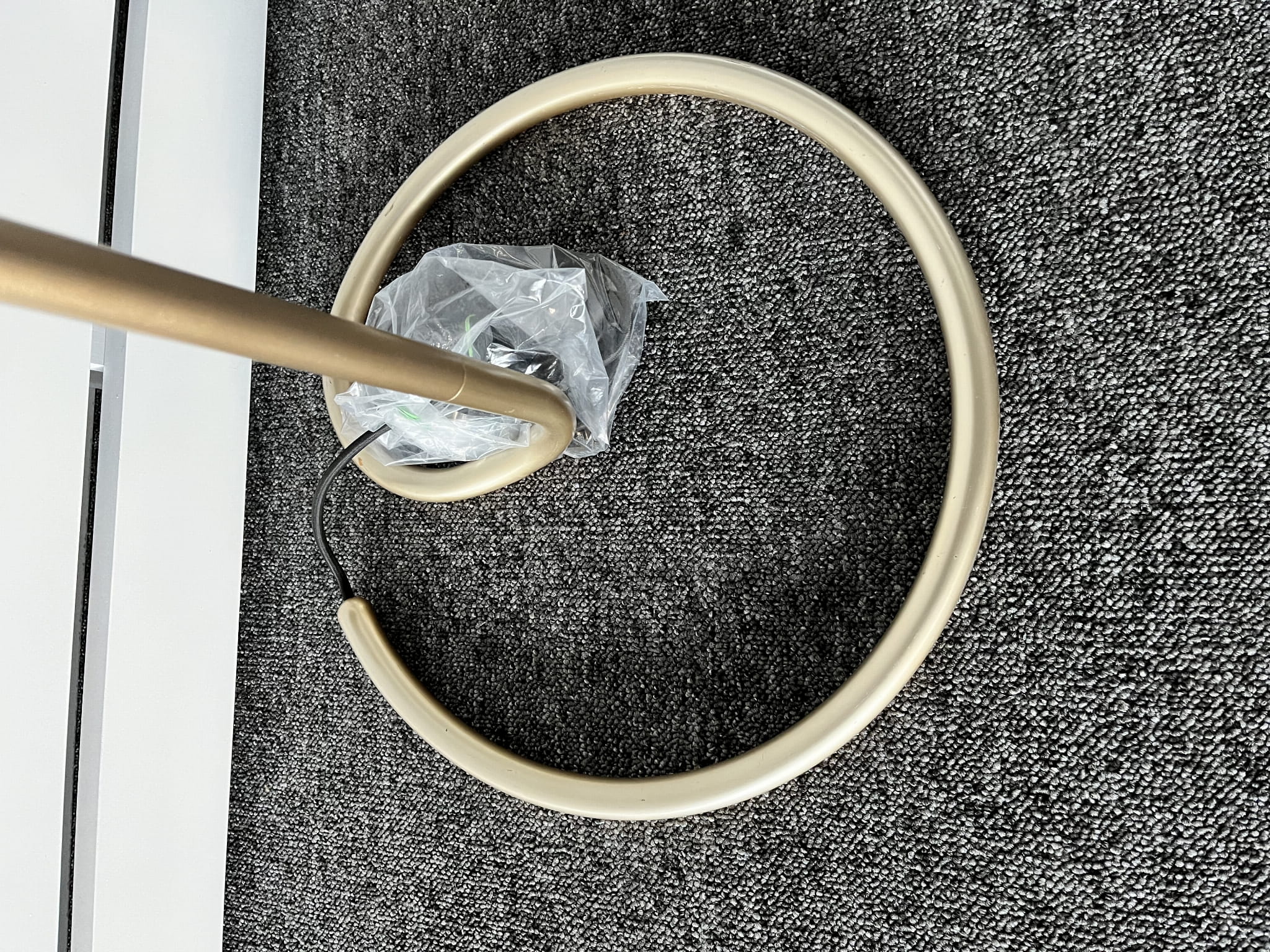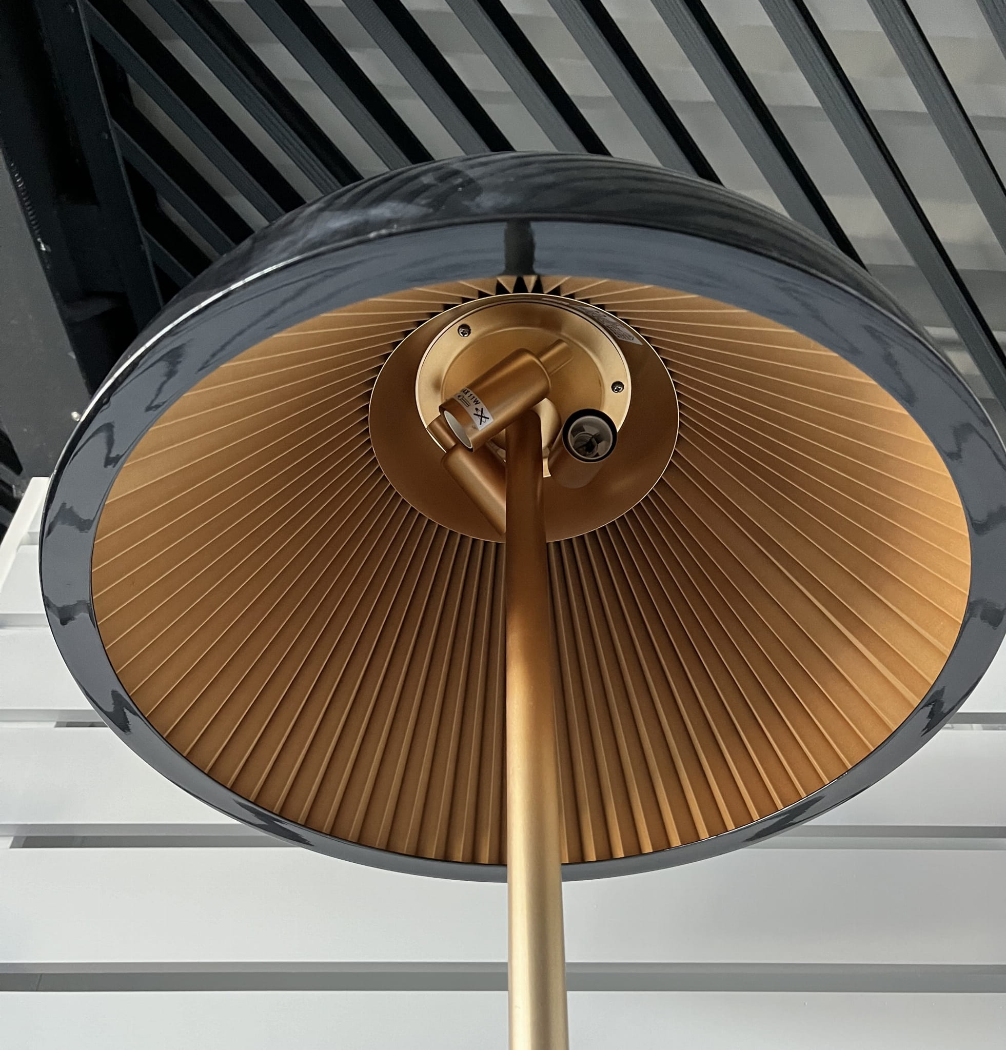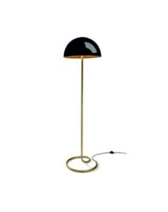 Lampa podłogowa wykonana z metalu w kolorze lekko złotawym oraz klosza z tworzywa w kolorze czarnym.