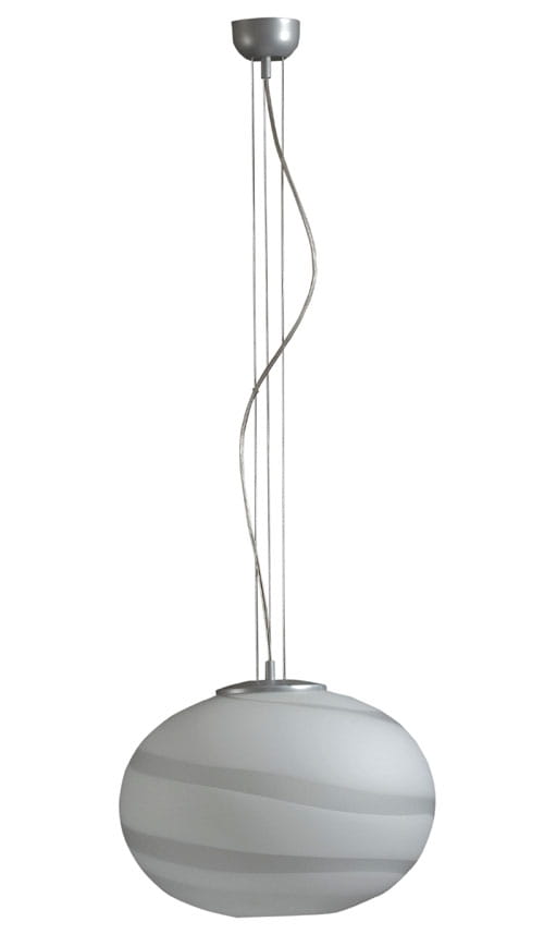 Lampa PUFA to oprawa o prostej eleganckiej formie z lekko spłaszczonym, kulistym kloszem szklanym w wersji ecru lun spirala.